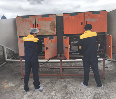 众所周知,长期使用的油烟机罩和抽风机、空气净化器、抽烟管道等如果不经常清洗,会有很多油渍残留在烟机上和烟道表面,时间久了会形成油垢,这些油垢使用简单的清洗方法是处理不掉的,这样会影响油烟机和烟道的使用,使烟流不易排除。本公司采用高压射流和强力化油剂,对烟道进行除油污处理后,再做保养。可使油烟气流明显好转,还可以在表面形成一层保护膜使油渍不易残留在风管表面。我们使用人工铲除油垢配合超强金属专用清洁剂,对油烟机表面油污清除效果显著,无毒、无味、不伤金属和瓷面。我司现已完成上百个大型油烟机的清洗工作。
